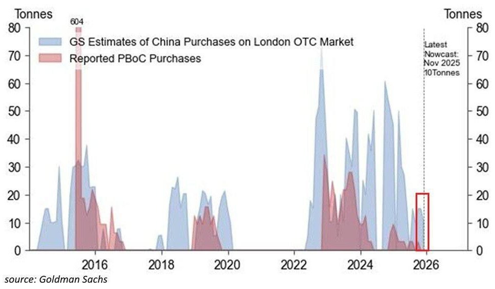 بر اساس برآوردهای گلدمن ساکس، چین در ماه نوامبر بیش از 10 تن طلا خریداری کرده است که این مقدار تقریباً 11 برابر بیشتر از آن چیزی است که به‌طور رسمی توسط بانک مرکزی چین اعلام شده است، همچنین در سپتامبر، خریدهای چین به بیش از 15 تن رسیده که 10 برابر بیشتر از گزارش‌های رسمی بوده است، این میزان خرید به‌طور غیررسمی به یکی از محرک‌های اصلی افزایش قیمت طلا در بازار جهانی تبدیل شده است.