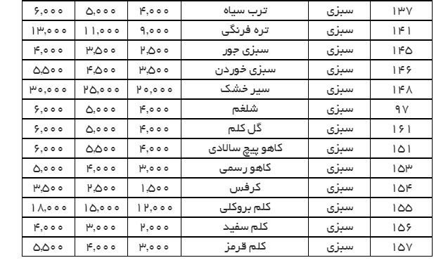 قیمت انواع سبزی و تره‌بار (هر کیلوکرم به تومان)