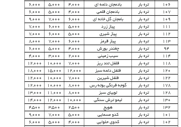 اتحادیه صنف بار فروشان میوه و تره بار تهران امروز نرخ انواع محصولات سبزی و تره‌بار را برای یک هفته آینده ( از مورخه 1399/08/19 لغایت 1399/08/25) اعلام کرد.