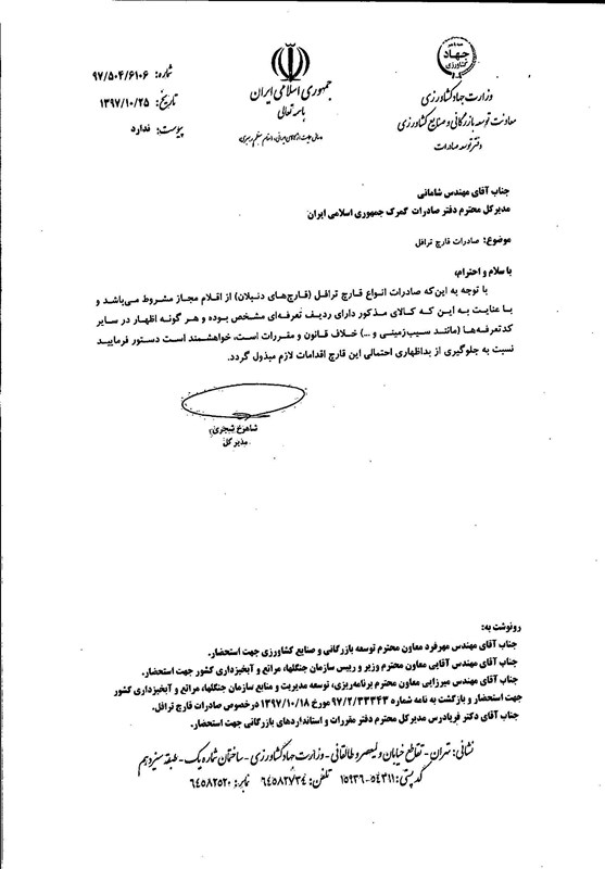 در نامه شاهرخ شجری مدیرکل معاونت توسعه بازرگانی و صنایع کشاورزی