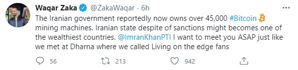 به گزارش یوتودی، وقار ذکا (Waqar Zaka)، مجری پرآوازه تلویزیون پاکستان با انتشار توییتی ادعا کرده است که بیت کوین میتواند ایران را بسیار ثروتمند کند و آن را در خنثیسازی تحریمهای اعمالشده از سوی ایالات متحده یاری دهد.