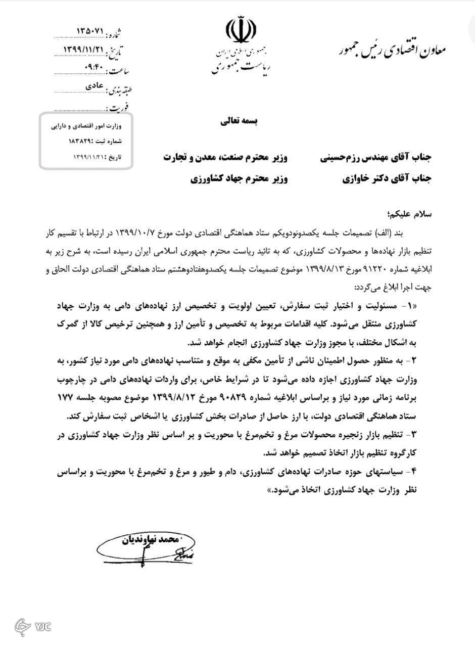 به گزارش خبر اقتصادی به نقل از باشگاه خبرنگاران جوان ، محمد نهاوندیان معاون اقتصادی رئیس جمهور در ابلاغیه‌ای به علیرضا رزم حسینی، وزیر صمت و کاظم خاوازی وزیر جهاد کشاورزی اعلام کرد: مسئولیت و اختیار ثبت‌سفارش، تعیین اولویت و تخصیص ارز نهاده‌های دامی به وزارت جهاد کشاورزی منتقل می‌شود و کلیه اقدامات مربوط به تخصیص و تامین ارز و همچنین ترخیص کالا از گمرک به اشکال مختلف با مجوز وزارت جهاد کشاورزی انجام خواهد شد.
