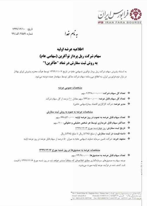 بر این اساس، آگهی عرضه اولیه سهام شرکت «ریل پرداز نوآفرین» با نماد «حآفرین» منتشر شد که مطابق آن روز چهارشنبه (۱۳ اسفند ماه) سهام این شرکت به شیوه ثبت سفارش جهت کشف قیمت در فرابورس عرضه خواهد شد.