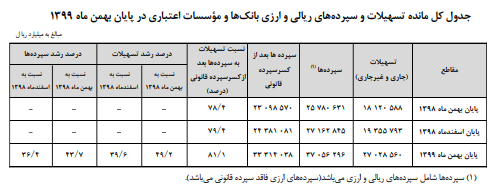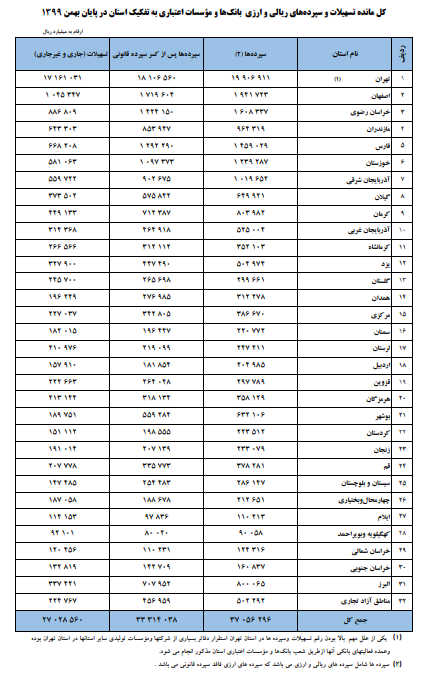 شایان ذکر است نسبت تسهیلات به سپردهها بعد از کسر سپرده قانونی ۸۱.۱ درصد است که نسبت به مقطع مشابه سال قبل و پایان سال قبل، به ترتیب ۲.۷ و ۱.۷ واحد درصد افزایش نشان میدهد. نسبت مذکور در استان تهران ۹۴.۸ درصد و در استان کهگیلویه و بویراحمد ۱۱۵.۱ درصد است.