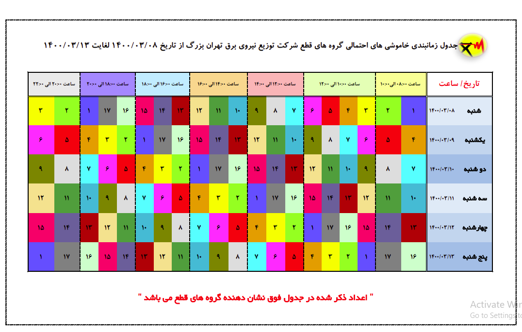 شرکت توانیر جداول خاموشی شهر تهران را برای امروز (یکشنبه نهم خرداد) منتشر کرد که بر این اساس برخی مناطق با دو ساعت خاموشی برق مواجه خواهند شد که به شرح زیر است؛