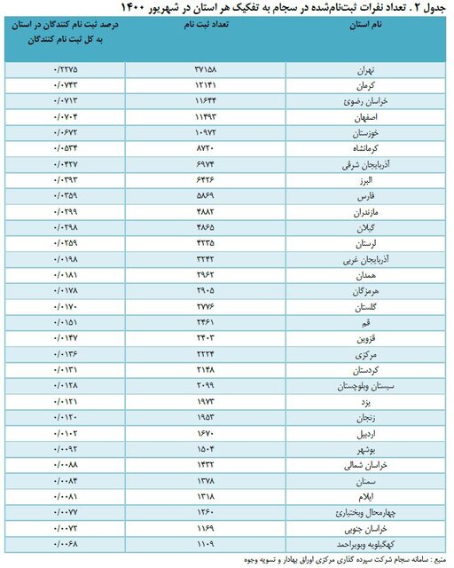 بر این اساس و طبق آمار شرکت سپرده گذاری مرکزی اوراق بهادار و تسویه، وجوه پنج استان «کهگیلویه و بویراحمد با ۱۱۰۹، خراسان جنوبی با ۱۱۶۹، چهارمحال و بختیاری با ۱۲۶۰، ایلام با ۱۳۱۸ و سمنان با ۱۳۷۸ مورد» در انتهای لیست کمترین ثبت نام شده‌های در بین سایر استان ها قرار دارند.