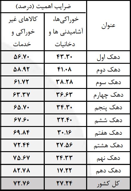 این درحالی است که وزن این دو در دهک دهم، به عنوان بالاترین دهک درآمدی جامعه به ترتیب حدود ۱۷ و ۸۳ درصد است.
