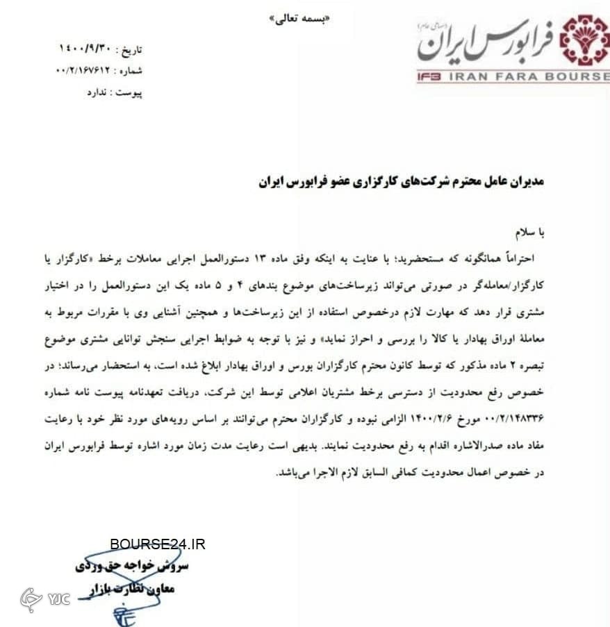 سروش خواجه حق‌وردی، معاونت نظارت بازار، در نامه‌ای به مدیران عامل شرکت‌های کارگزاری، رسما اعلام کرد: دریافت تعهدنامه از مشتریان برخط دیگر الزامی نیست و کارگزاران می‌توانند براساس رویه‌های مورد نظر خود به رفع محدودیت اقدام کنند.