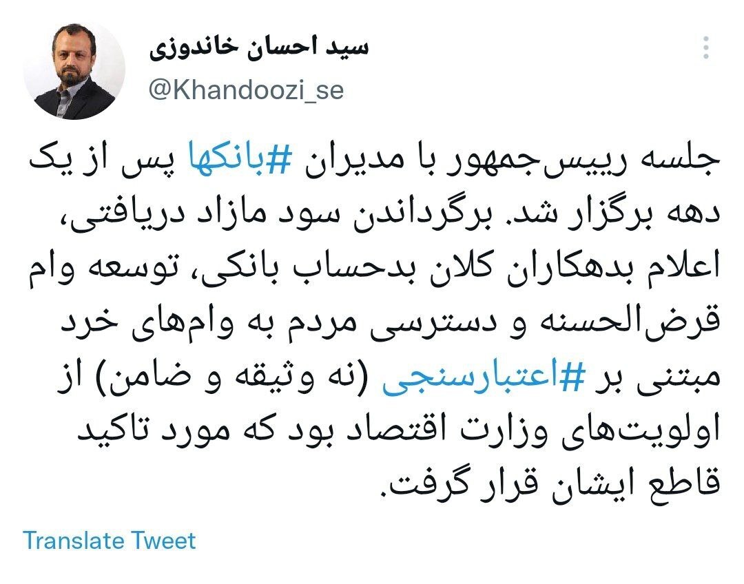 جلسه رئیس جمهور با مدیران بانک ها پس از یک دهه برگزار شد، این را خاندوزی با انتشار پستی در صفحه شخصی توییتر خود اعلام کرد.