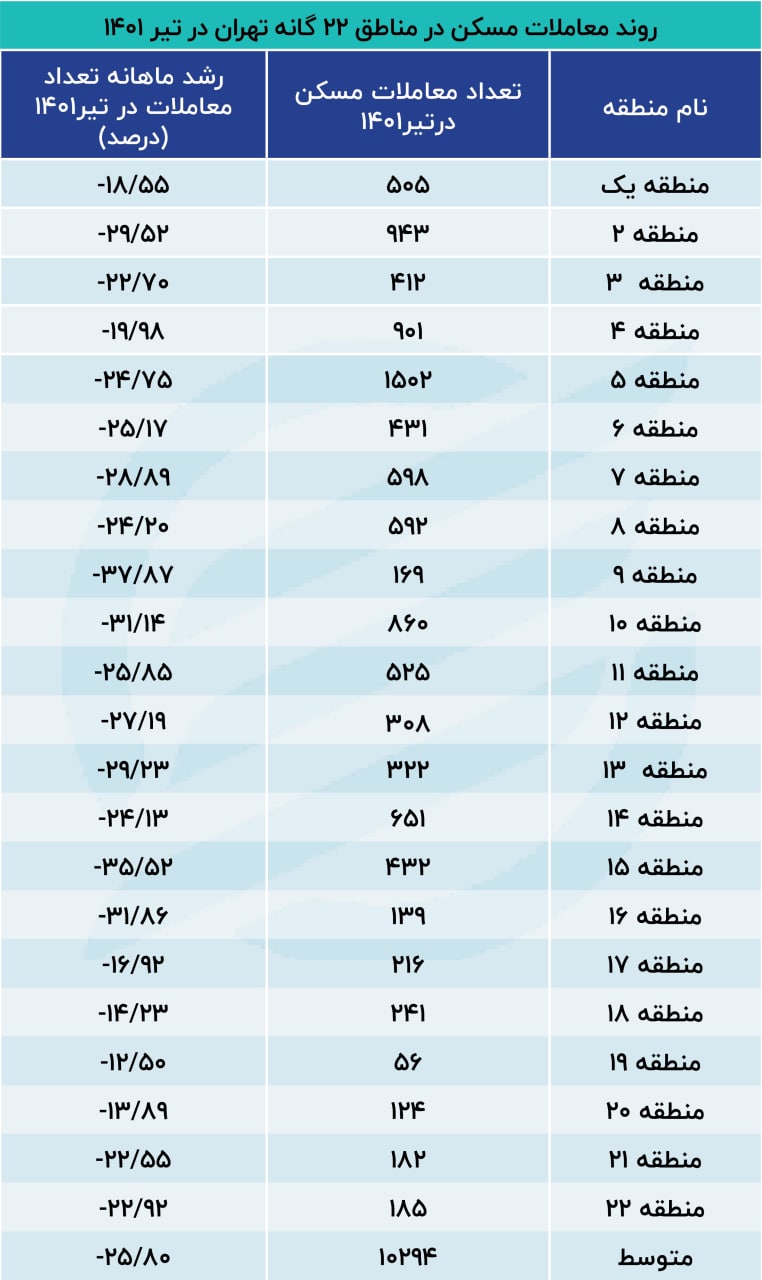 براساس آمار بانک مرکزی تعداد معاملات ثبت شده در تیر ماه نسبت به ماه قبل ۲۵.۸۰ درصد کاهش داشته است. منطقه ۹ با ریزش ۳۷.۸۷ درصدی رکورد دار کاهش معاملات بوده است. در این ماه ۲۷۵ معامله در این منطقه انجام شده است. در منطقه ۱۵ نیز۱۷۶ معامله انجام شده که نسبت به ماه گذشته ۳۵.۵۲ درصد کاهش معاملات مسکن را تجربه کرده است. منطقه ۱۶ نیز در جایگاه سوم ریزش معاملات مسکن قرار دارد و کاهش ۳۱.۸۶ را پشت سر گداشته است. مناطق ۱۰،۲،۱۳،۷،۱۲و ۱۱بیش از متوسط ریزش معاملات مسکن در تیرماه، دچار ریزش خریدار شده اند.