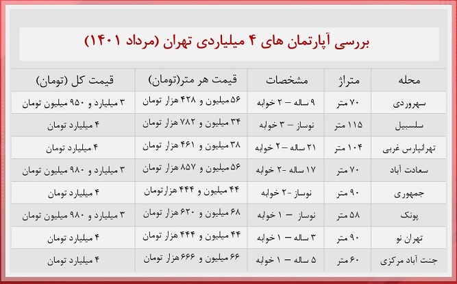 اگر با بودجه ۴ میلیارد تومان قصد خرید واحدی تک خوابه در تهران دارید، میتوانید واحدی ۹۰ متری در تهراننو که ۳ سال از ساخت آن گذشته باشد را با این قیمت خریداری کنید.