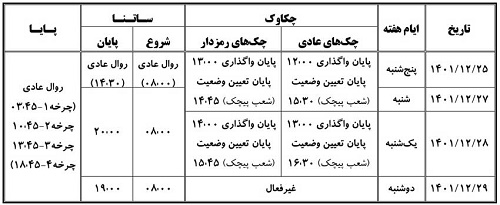 زمان پایانی واگذاری چکهای رمزدار نیز در دو روز ٢٥ و ٢٧ اسفندماه ساعت ١٣ و زمان پایان تعیین وضعیت آنها در شعب ساعت ١٤:٤٥ اعلام شده است. زمان پایان واگذاری چکهای رمزدار در روز یکشنبه ٢٨ اسفندماه ساعت ١٤ و زمان تعیین وضعیت آنها ١٥:٤٥ در نظر گرفته شده است. بر اساس این اطلاعیه سامانه چکاوک در روز ٢٩ اسفندماه غیرفعال است.